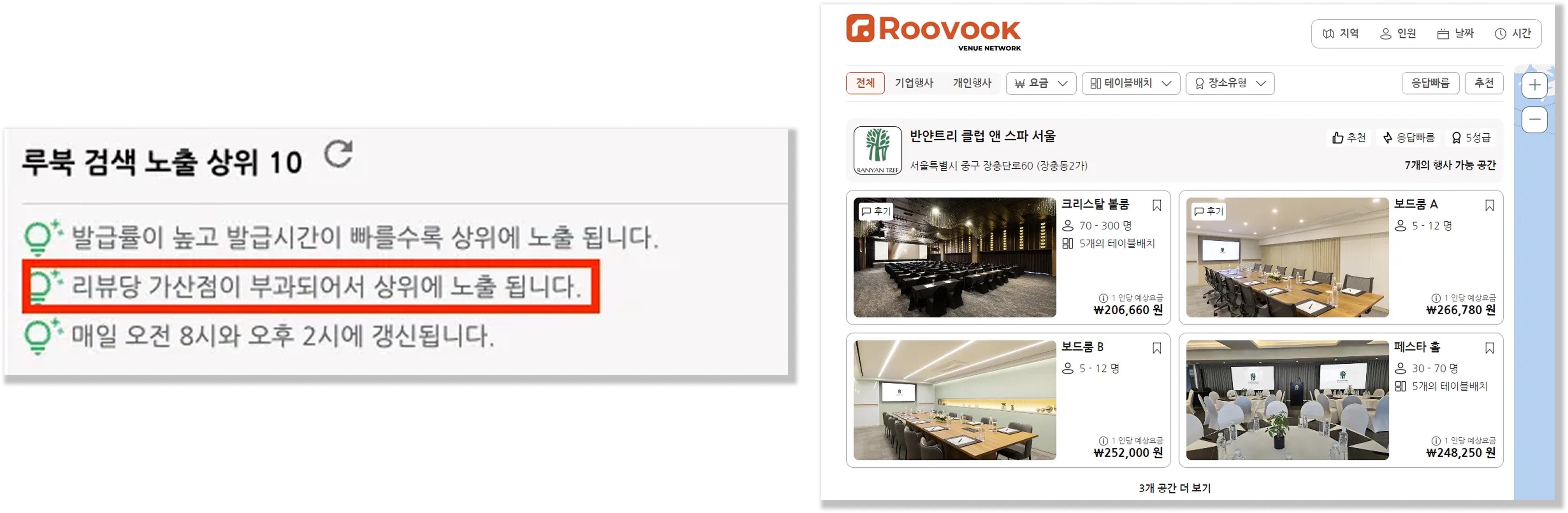 단체객실, 대관 리뷰가 많을수록 구글, 네이버 검색 노출과 루북 플랫폼 내 상위에 랭크됩니다.